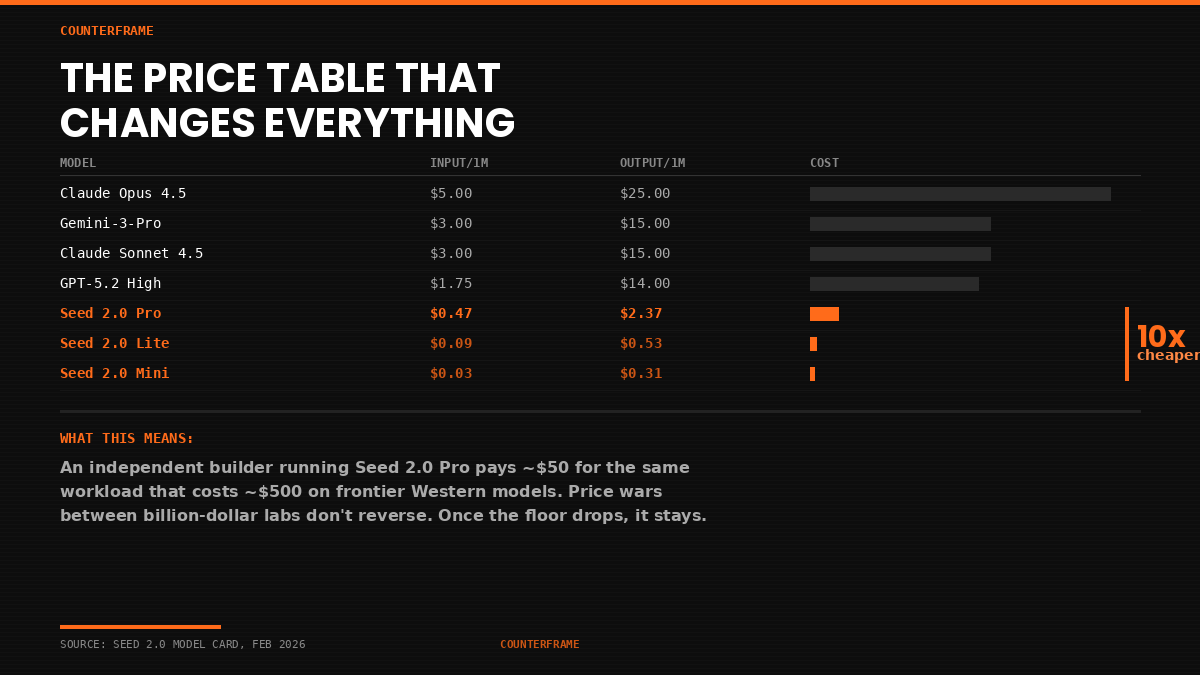 The cost objection is dead. Frontier-level AI intelligence is available at prices that would have been unthinkable 18 months ago. Whether you use Seed 2.0 directly or just benefit from the downward price pressure it puts on every other provider, the economics permanently shifted in your favor this week.