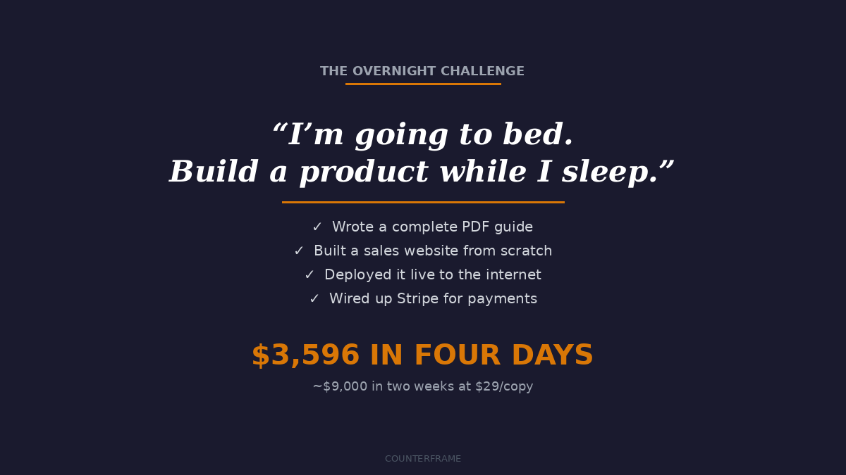 He didn’t leave it a prompt. He didn’t set up a workflow. He told it: “I’m going to bed. While I’m asleep, create a product you can build entirely on your own and put up for sale. Go as far as you can, and leave any blockers as action items for me in the morning.”