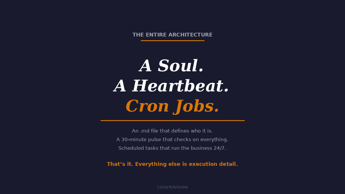 The entire architecture, as Nat describes it: “A soul, a heartbeat, and cron jobs.”