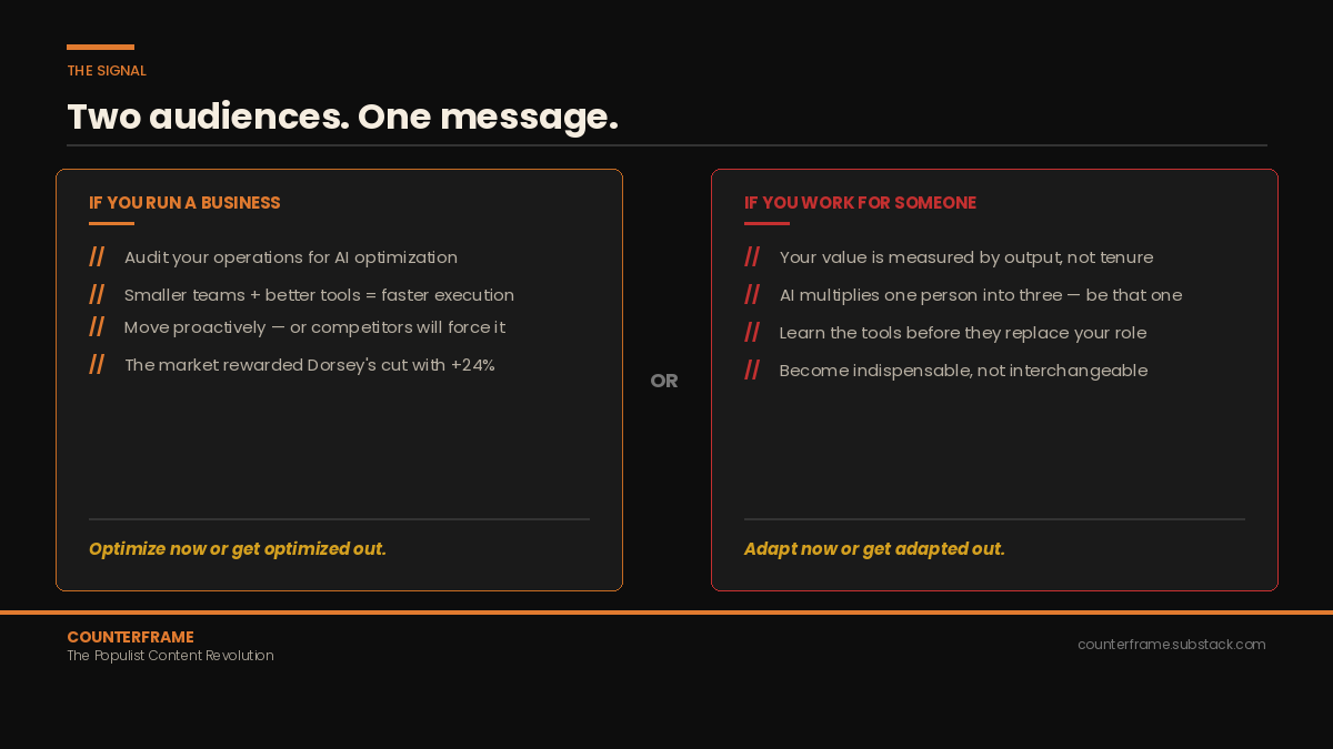 Block's 40% workforce reduction isn't a warning shot. It's the starting gun. Whether you're running a business or working for one, the message is the same: adapt now or get adapted out.