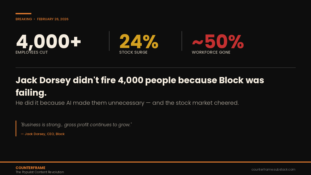 Dorsey just showed you the math. A company doing $2.87 billion in quarterly gross profit — growing 24% year over year — looked at its headcount and decided it was carrying nearly double the people it needed.
