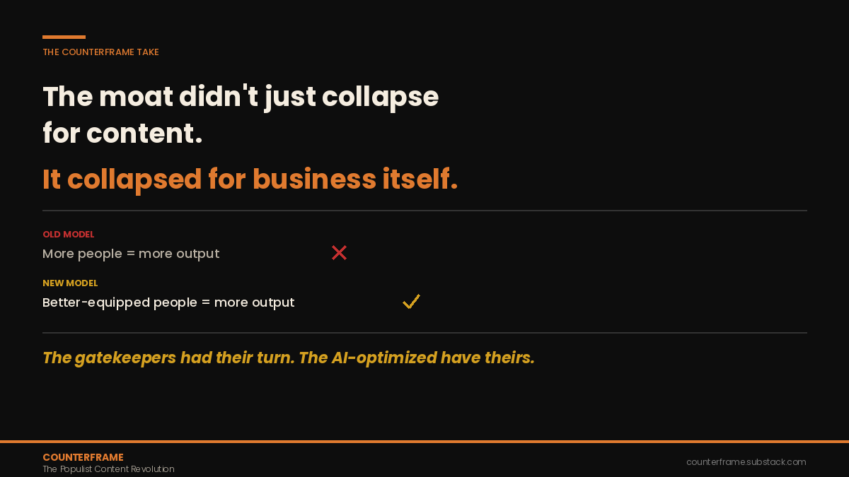 The moat didn’t just collapse for content. It collapsed for operations. For business itself.