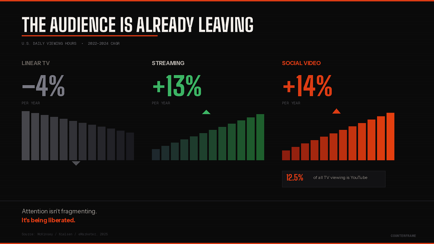 McKinsey frames this as a problem: consumer attention is “fragmenting.” That’s the gatekeeper’s word for losing control. From where the rest of us sit, attention isn’t fragmenting—it’s being liberated. People are choosing what they actually want to watch instead of choosing from what seven companies decided to make.